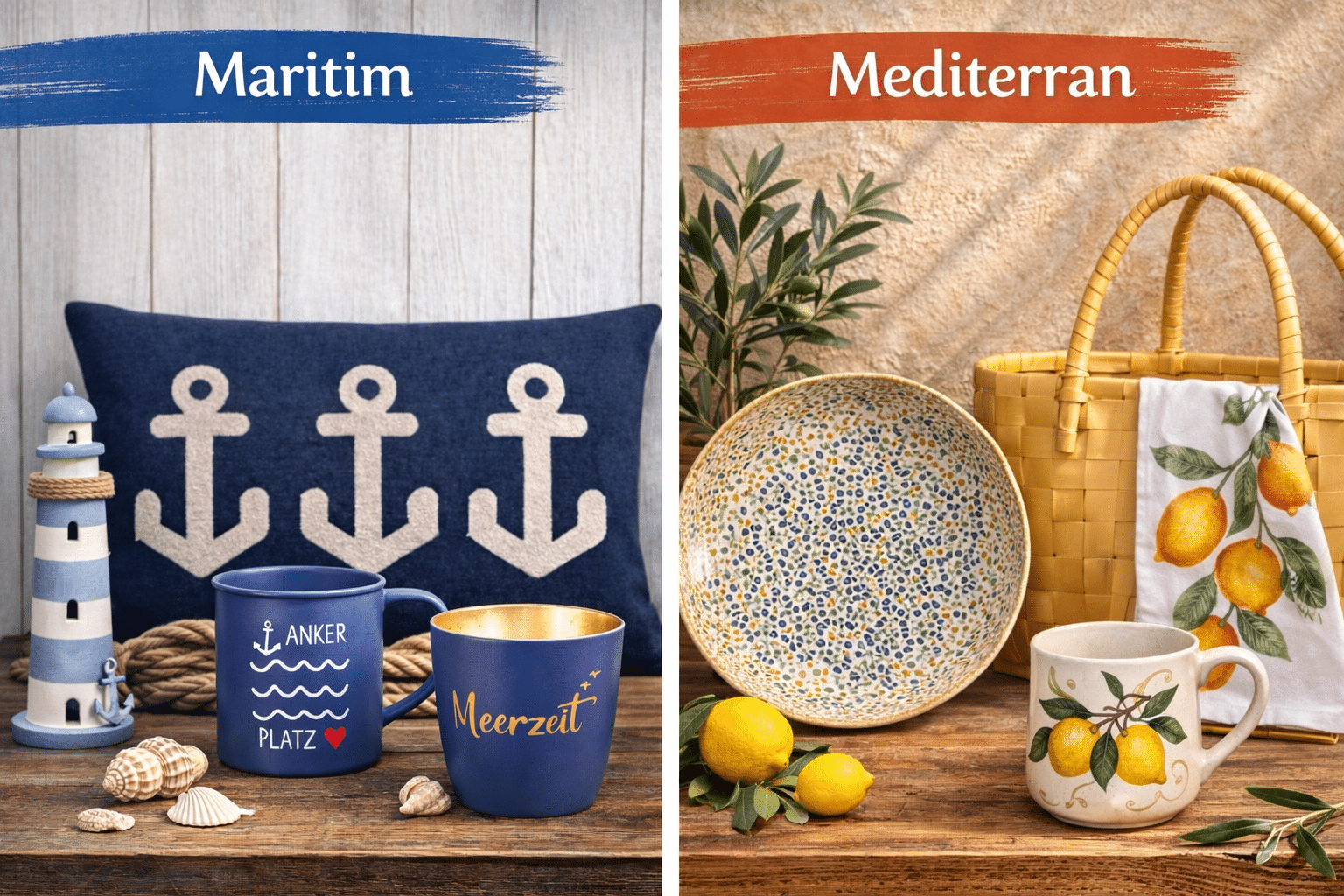 Du liebst das Meer – aber welcher Stil passt eigentlich besser zu dir? Kühlblaue Nordsee-Vibes oder warme Amalfiküste? Maritime und mediterrane Deko haben beide ihre eigene Magie, und oft verschwimmen die Grenzen. Damit du beim nächsten Einrichten genau weißt, was du dir nach Hause holst, erklären wir den Unterschied – und zeigen, wie du beide Welten wunderbar kombinieren kannst.