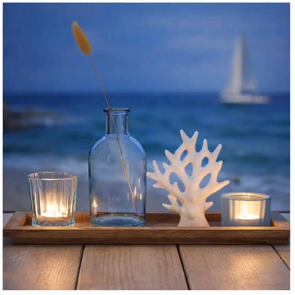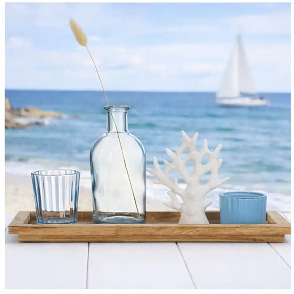 Stell dir vor, du sitzt mit einem kühlen Drink am Fenster, der Blick schweift über das glitzernde Meer, während sanfte Sonnenstrahlen dein Zuhause in warmes Licht tauchen. Genau dieses Gefühl holst du dir mit dem cozy coral Deko-Set auf den Tisch. Das stilvolle Ensemble aus Holz, Vase und Windlichter aus Glas und einer kunstvollen Koralle lässt sich ganz nach deinem Geschmack arrangieren und bringt entspannten Boho-Charme auf dein Sideboard, die Fensterbank oder als liebevolles Highlight auf dem Esstisch. Jedes Teil erzählt seine eigene kleine Urlaubsgeschichte – mal rau wie Treibholz, mal schimmernd wie Morgentau auf den Wellen. Lass deiner Kreativität freien Lauf und dekoriere dir deine persönliche Wohlfühloase.
