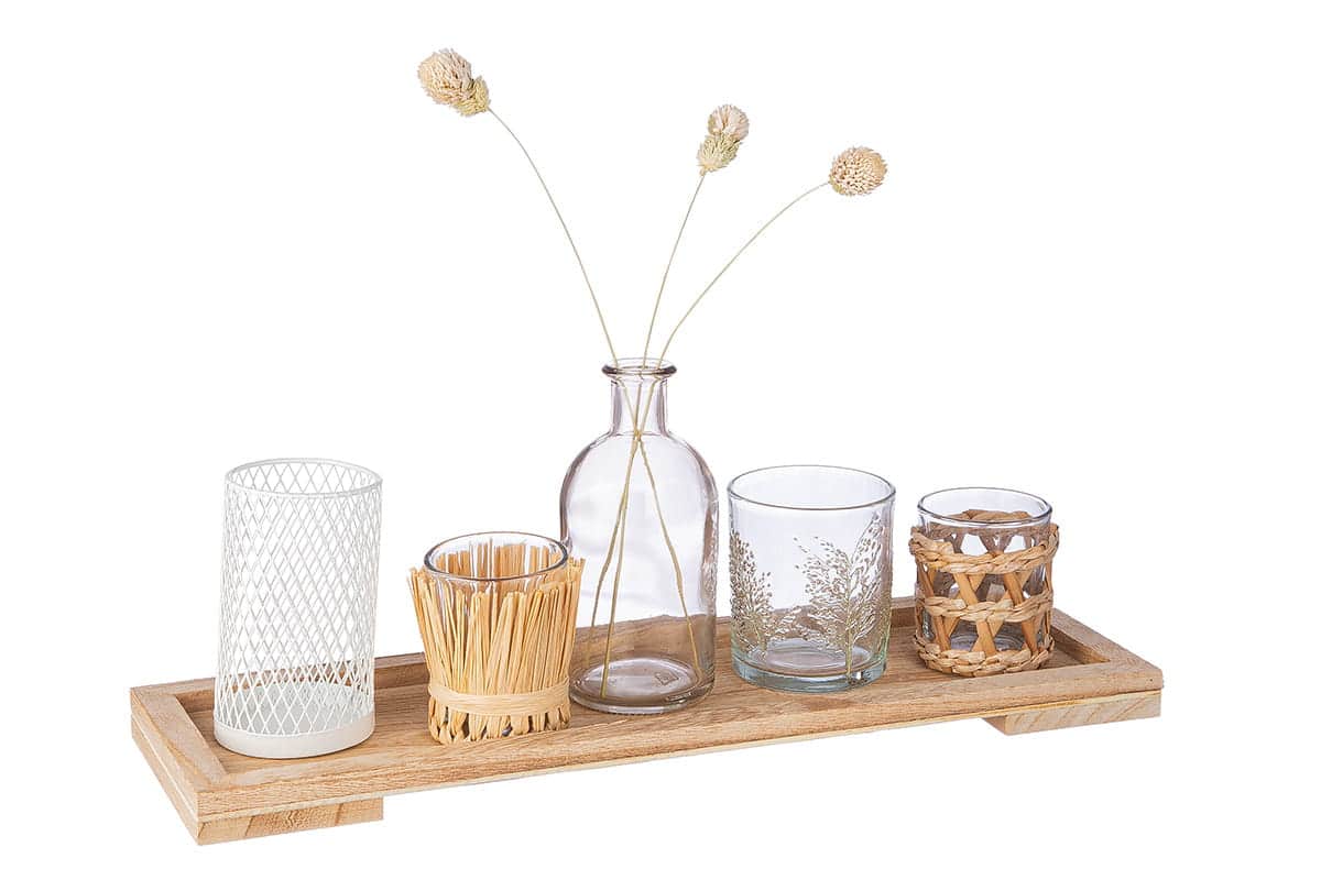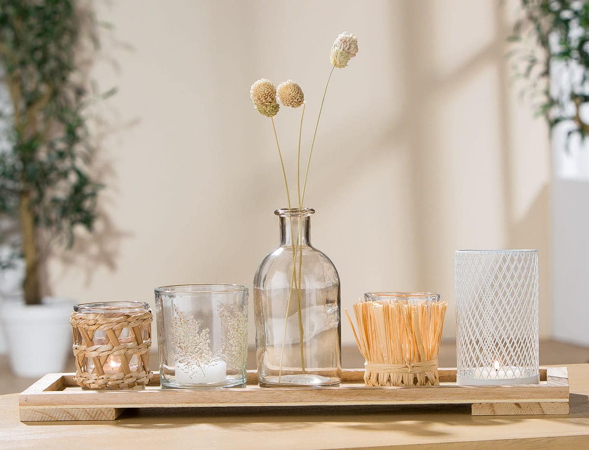 • Inhalt: 4x Windlichter, 1x Vase, 1x MDF-Tablett (inkl. Blumendekoration)