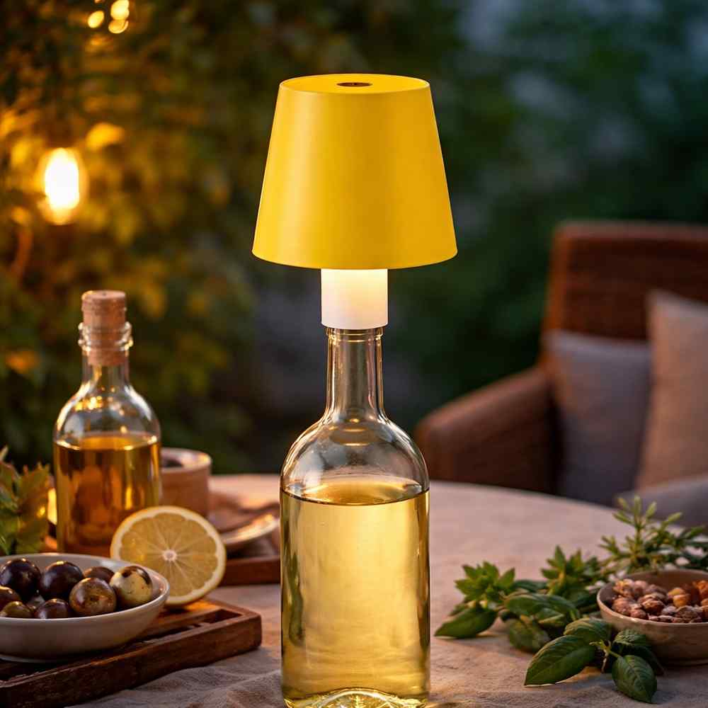 Einfach auf eine Flasche setzen – und schon wird daraus eine stilvolle, kleine Lampe für den Abend, für den Balkon, Terrasse oder Wohnzimmer. Der Metallschirm in hellem Gelb sorgt dafür, dass das Licht gezielt nach unten strahlt und eine angenehme, blendfreie Atmosphäre entsteht.