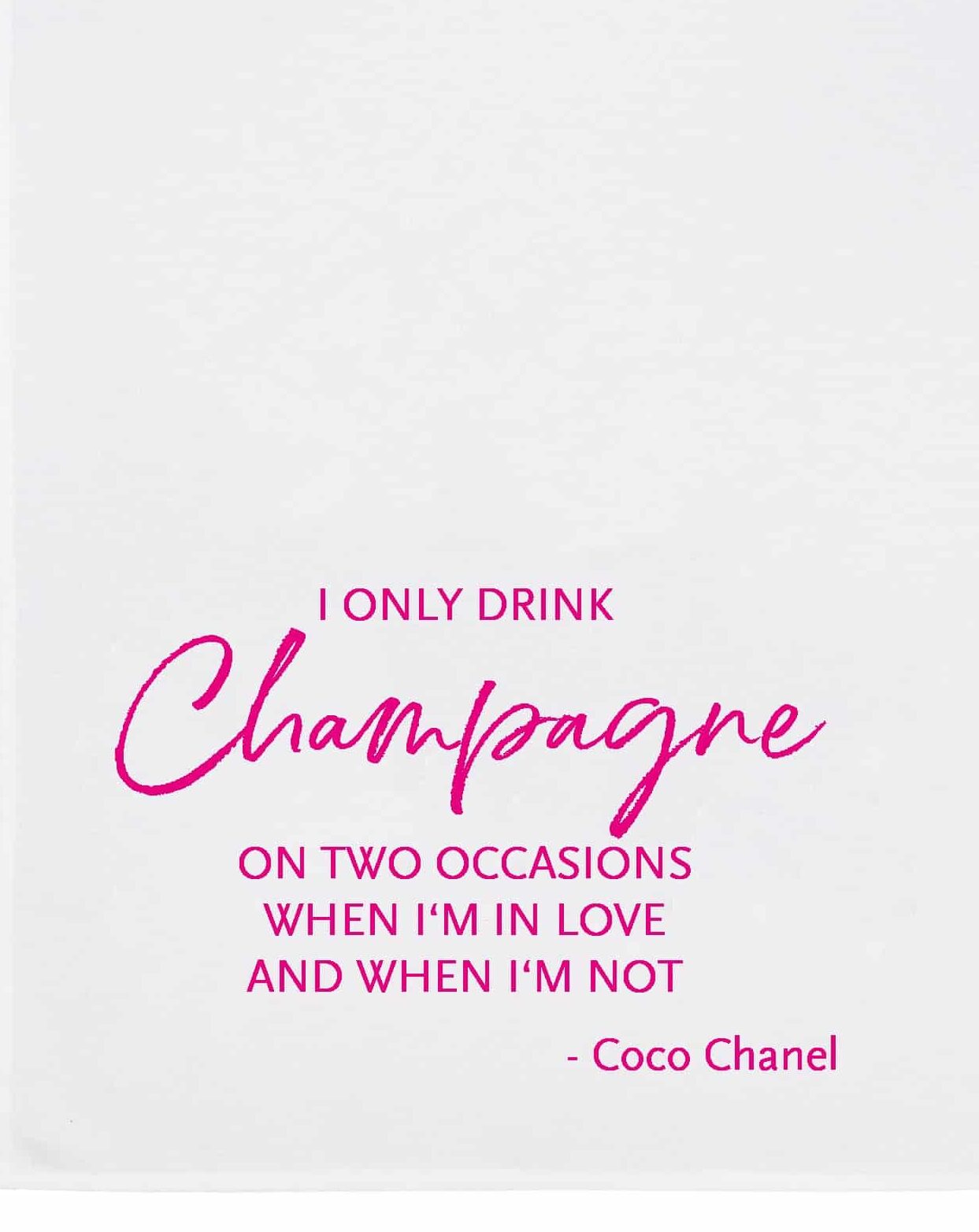 Dieses weiße Geschirrtuch mit dem leuchtend-pinken Spruch „I only drink Champagne“ bringt dir Spaß, wenn du in deiner Küche stehst. Der Stoff fühlt sich weich und hochwertig an. Der Spruch bringt in jedem Spülmoment ein kesses Augenzwinkern – wie ein Glas prickelnder Champagner im Sonnenlicht eines lauen Sommers. Dieses Tuch begleitet dich mit Stil durch deinen Alltag und lässt dich zwischendurch immer wieder innehalten.