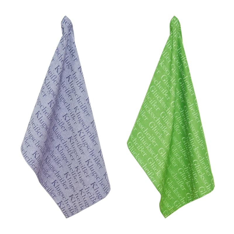 2er-Set Geschirrtücher: 1× „Klugscheißer“, 1× „Glücksscheißer“