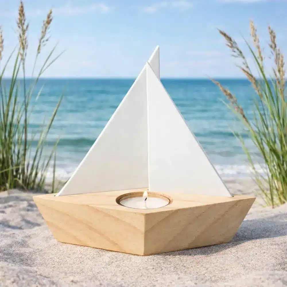 Die Sonne versinkt langsam am Horizont, während eine sanfte Brise den Duft von Salz und Freiheit heranträgt. Das Meeresrauschen Lichtschiff “Summer breeze” flackert leise und taucht dein Zuhause in das warme Leuchten eines langen Sommertages am Meer.