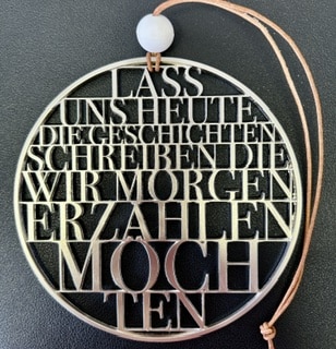 Dieses filigrane Poesie Metallbild von Räder bringt genau dieses Gefühl mit – leicht, ruhig und voller Bedeutung.Der feine Schriftkreis mit dem Spruch „Lass uns heute die Geschichten schreiben, die wir morgen erzählen möchten“ ist mehr als Deko. Er ist Erinnerung, Impuls und ein kleines Stück Lebensgefühl. Ob am Fenster, an der Wand oder auf der Terrasse – das leichte Metall spielt mit Licht und Schatten und wirkt dabei nie aufdringlich, sondern genau richtig. Besonders schön: Durch das offene Design entsteht je nach Lichteinfall immer wieder ein neuer Look.