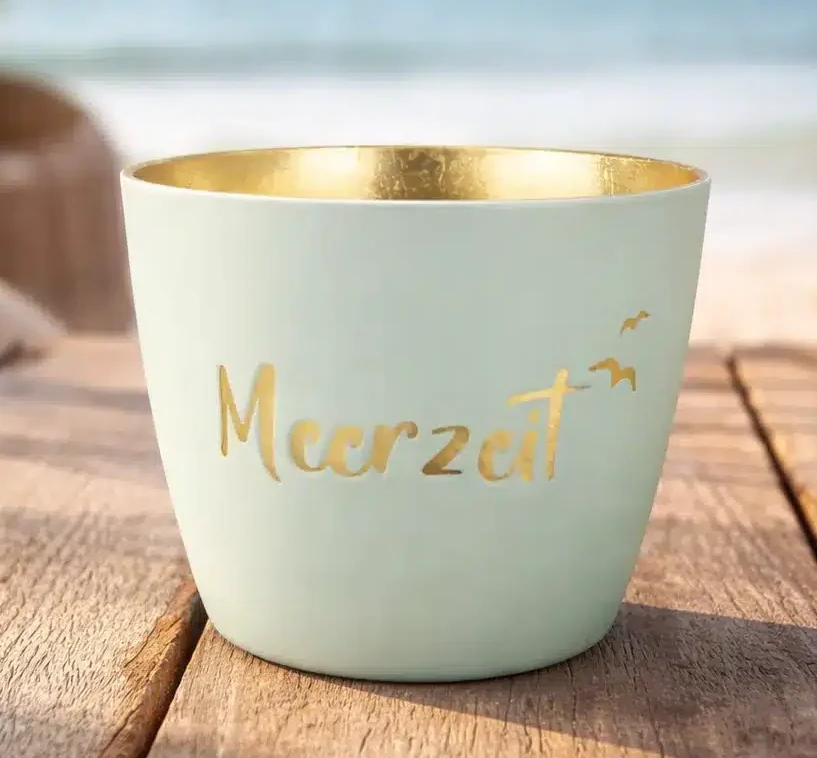Startseite / Shop / Garten & Terasse / Windlichter / Windlicht Meerzeit Hellblau/Gold 10 x 8,5 cm